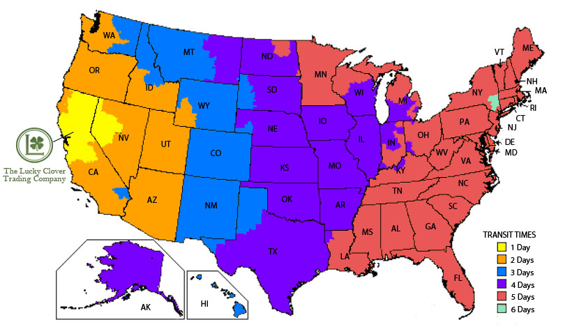 The number of days an order is spent in transit via carrier is based on the number of business days following the day of shipment from our Benicia, CA warehouse (not including Saturday, Sunday or holidays). The above map provides an approximate guide. Weather, carrier failure, and other unforeseen events may cause delays in final arrival time. Such delays are not subject to freight refunds or adjustments.